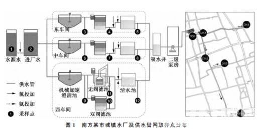 在原水?凈水廠及其供水管網(依 據 供 水 距 離? 管道 材 料?流 速 等)設 置 18 個 采 樣 點,詳 見 圖 1 所示。