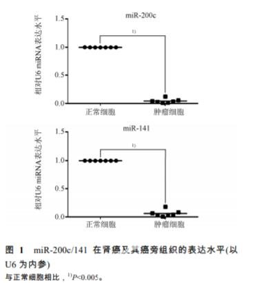 在腎癌組織中顯著下調 實時熒光定量 PCR 檢測 7 對配對腎癌及癌旁 組織中 miR-200c/141 表達水平,結果腎癌組織與 其配對癌旁組織相比,miR-200c/141 表達水平均 顯著下調,見圖 1?患者組織信息見表 1