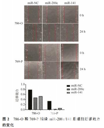 786-O 和 769-P 細胞接種于 6 孔板中,基于 1640 培養基體積計算濃度,加入終濃度為 2.5 μmol·L-1 地西他濱誘導 3 d 或轉染 30 nmol·L-1 的 miR-200c/141 2 d 后,用 200 μL 槍頭劃線,PBS 清洗黏附的細胞碎片,培養基換為無血清培養基? 分別于劃線 0,24 h 后用配置有尼康數碼照相機的 尼康倒置鏡像顯微鏡進行拍照。