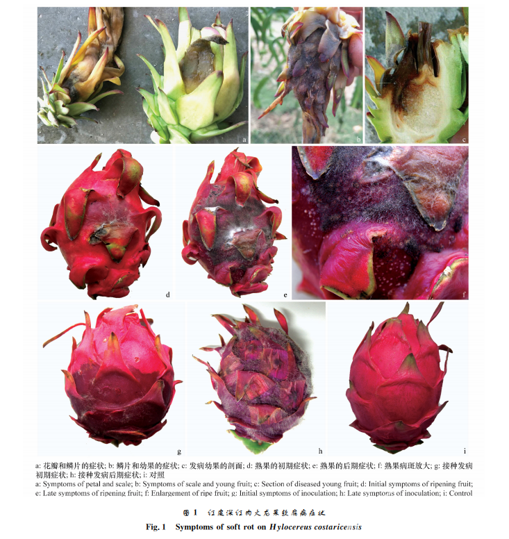 對(duì)健康的紅皮 深 紅 肉 火 龍 果 果 實(shí) 進(jìn) 行 接 種,以 無(wú)菌的 PDA 為對(duì)照,5d后針刺傷接種的果實(shí)全部 發(fā)病,接種產(chǎn)生的癥狀與田間發(fā)病的癥狀相同(圖 1g~h),而對(duì)照果實(shí)不發(fā)?。▓D1i)。對(duì)發(fā)病組織進(jìn) 行再分離,可得到與原分離株相同的病原菌,符合柯 赫氏法則,證明接種菌為火龍果軟腐病的致病菌。