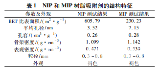 表 1 為吸附劑 MIP 和 NIP 的表面主要物理性 質及結構特征. 從表中可以看出,MIP 比 NIP 的比表 面積有所下降,但是孔徑和孔容都有所增大. 這可能 是進行分子印跡后,樹脂表面產生了與模板分子苦參堿所匹配的印跡孔穴,比未印跡過的樹脂表面孔 洞要更大、更有規則.