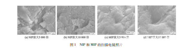 圖 1 分別為 NIP 和 MIP 樹脂的掃描電鏡圖片. 由圖可以看出: NIP 和 MIP 樹脂表面十分粗糙,NIP 樹脂分布著很多孔洞,且存在一定塌陷,極性基團的 引入使得內部孔洞塌陷造成表面粗糙,同時使得孔 洞形狀不規則; MIP 樹脂孔洞的形狀較為規則,分子 印跡聚合物制備過程中加入特定的模板分子苦參 堿,去除模板分子后,留下的孔洞形狀較為規則,這 有利于對模板分子的特異性識別吸附.