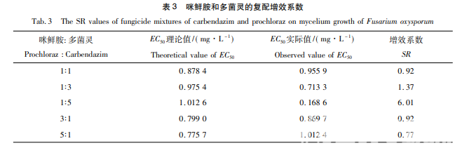 復配殺菌劑對橡膠樹枯萎病病原菌的抑制效果見 表 2,由表 2 可見,咪鮮胺和多菌靈 1∶ 1,1∶ 3,1∶ 5,3∶ 1 及 5∶ 1 復配條件下 EC50值分別為 0. 96,0. 71,0. 17, 0. 87,1. 01 mg·L - 1 ,1∶ 5 的復配效果最佳,5∶ 1 的復配效果最差。咪鮮胺和多菌靈的復配增效系數見表 3,由表 3 可見,咪鮮胺和多菌靈 1∶ 1,1∶ 3,3∶ 1 及 5: 1 復配條件 下增效系數分別為 0. 92,1. 37,0. 92,0. 77,均在 0. 5 ~ 1. 5 之間,2 者藥效作用為相加作用,無拮抗作用。 咪鮮胺和多菌靈配比在 1∶ 5 時,SR 值為 6. 01,表現為增效作用。