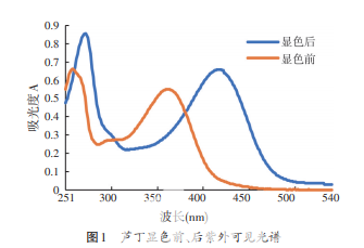 黃酮類化合物經 AlCl3顯色后,與鋁離子形成穩 定的絡合物,苯甲?;糠忠鸬奈諑?300~ 400 nm)紅移,吸光度明顯增大且專屬性提高。蘆丁 經 AlCl3顯色后,其 365 nm 處吸收峰紅移至 416 nm, 且吸光度有所增加,見圖1。