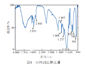 從圖1可以看出:在波數為2 951和2 843 cm-1 處有C—H鍵的面內彎曲振動吸收峰;在波數為 1 465,1 408和1 277 cm-1 處 有C—H鍵 的 面 內 彎 曲 振 動 吸 收 峰;在 波 數 為1 113和585 cm-1 處 有 Si—O—Si鍵的對稱伸縮振動吸收峰;在波數為829 cm-1 處有Si—OCH3鍵的特征吸收峰;在波數為780 cm-1 處有Si—C鍵的伸縮振動吸收峰;在波數為 1 500~1 690 cm-1 處未出現C=C鍵的特征吸收 峰,說明聚合物中沒有C=C鍵的存在,即合成出 的產物結構與預期一致。200 ℃下復合材料質量損失 率很??;300和400℃下復合材料質量損失率較空 白樣明顯增大,說明OPS可以明顯提高復合材料的 耐熱老化性能。這是因為加入OPS后,OPS在高溫 下發生脫醚反應,部分與高溫下含自由基的硅橡 膠乙烯基發生交聯反應使其仍保持彈性;剩余自 由基可捕捉乙烯基硅橡膠分子鏈上被氧化而產生 的自由基,抑制乙烯基硅橡膠的分解反應,從而提 高復合材料的耐熱老化性能 。該結果與熱重分 析結果基本保持一致。且OPS脫醚 后可能與橡膠基體發生交聯反應,使得復合材料 的交聯密度增大,力學性能提高。但交聯密度過 大時,交聯結構過分緊密,復合材料的韌性降低, 導致復合材料的力學性能下降。同時隨著OPS用 量的增大,OPS小分子化合物量增大,這些小分子 化合物混合時不易分散均勻,易形成應力集中點 而引發復合材料發生脆性斷裂,導致其力學性能下降。
