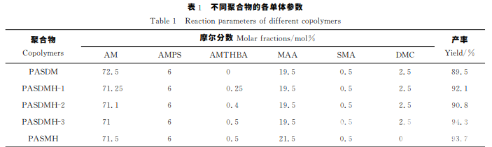 本實驗采 用 自 由 基 膠 束 共 聚 法,將一 定 量 的 AM、AMPS溶解在蒸餾水中,混合加入 MAA,以及提 前溶解在乙 醇 中 的 定 量 AMTHBA、SMA 以及 DMC。 充分攪拌混合溶液,通過滴加1mol/L 的 NaOH 將溶 液pH 調(diào)節(jié)至7。向溶液中加入SDS,使未溶解的疏水 單體溶解于SDS的增溶膠束中??刂茊误w總固含量為 10 %,混合溶劑乙醇和水的質(zhì)量比為1∶10。將混 合 溶液加入裝 有 攪 拌 裝 置 的 三 口 瓶 中,恒 溫 反 應(yīng)。通 過 注射器將偶氮二異丁基脒鹽酸鹽(AINA)注入三口瓶, 70 ℃條件 下 反 應(yīng)5h后結(jié) 束。向產(chǎn)物中加入無水乙 醇,充分攪拌至 析 出 沉 淀,反復(fù)浸泡并洗滌沉淀物,烘 干即得到聚 合 物 PASDMH。利 用相同的反應(yīng)工藝制 備一系列不同辣素含量以及 不 含 DMC 單體 的 疏 水 締 合聚合物,并測試它們的化學性能。疏水締合聚合物的單體組成比例詳見表1。