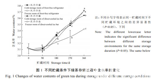 茶葉含水率是影響茶葉品質的關鍵因素。由圖 1 可知,各貯藏環境下的茶葉含水 率均隨著存儲時間的延長而增加,其中 90~360 d 貯藏期內的茶葉含水率變化幅度較 大,而風冷冷凍的含水率增幅最小。貯藏 360 d 時,風冷冷凍的含水率最低(P<0.05),為 3.42%,與原樣相比僅增加 9.94%,風冷冷藏 和直冷冷凍的含水率為 3.72%,最高于其他兩 種(P<0.05),與原樣相比增加 19.23%。由此 可知,綠茶長期貯藏時,風冷冰箱中的冷凍室 最有利于茶葉原含水率的保持,其余貯藏條件 的含水率相對較高,但也均在茶葉合理的含水 率范圍內(小于 5%)。在茶葉起始含水率 相同的情況下,其貯藏過程中水分對其品質的 影響主要來自于環境濕度,環境濕度在 10%~45%時,茶葉增濕最小,風冷冰箱和 直冷冰吧均達到此要求,區別在于風冷冰箱通 過風扇強制空氣進行制冷,空氣流動性大,直 冷冰吧則通過蒸發器進行自然對流,故同為冷 藏室環境濕度前者波動范圍(25%~45%)小 于后者(34.1%~34.5%),即直冷冰吧更能精 確的控制濕度。各貯藏環境下茶葉含水率的變 化與冰箱、冰吧自身的制冷方式不同導致微域 環境的差別有關。