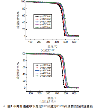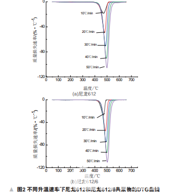將尼龍612、尼龍612/6共聚物樣品在真空干燥 箱中干燥,時(shí)間12 h、溫度 115℃、真空度0.1 MPa;在 真空環(huán)境中冷卻,取樣2~3 mg。在熱重分析儀中 保持N2吹掃,流量40 ml/min,然后分別以10、20、30、 40、50℃/min的升溫速率由室溫升至650℃,記錄物 質(zhì)質(zhì)量隨溫度與時(shí)間的變化關(guān)系,得到熱失重(TG) 及其一階微分曲線(DTG)。
