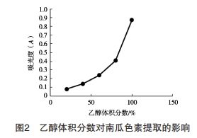用6種不同的料液比對南瓜色素進行提取,試驗 結果如圖1所示??煽闯瞿瞎仙氐奈舛仍?.1~0.3 之間,曲線呈下滑趨勢,料液比越低,南瓜色素的提 取效果越好。料液比較低,曲線下滑很快,在1︰ 8~1︰12(g/mL)間處于較平穩狀態;料液比較高, 南瓜色素的吸光度繼續快速下降,考慮到試驗的方便 性,可選擇1︰10(g/mL)的料液比作為南瓜色素提 取的條件。 用5種不同的乙醇體積分數對南瓜色素進行提 取,試驗結果如圖2所示。可看出乙醇體積分數對南 瓜色素的提取曲線呈上升趨勢,且越來越陡,當乙醇 體積分數為100%時吸光度達到最大值,因此當乙醇 體積分數為20%,40%,60%和80%時南瓜色素的提 取效果均不好,無水乙醇效果最好。