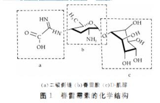 春雷霉素(Kasugamycin)又名春日霉素?加收米?加瑞農(nóng)等,是由春日鏈霉菌(Streptomyceska-sugaensis)所產(chǎn)生的一種氨基糖苷類抗生素.春雷霉素作為農(nóng)用殺菌劑,被廣泛應(yīng)用于農(nóng)業(yè)生產(chǎn),不僅具有較好的防治植物疾病的效果,并且對(duì)人畜無(wú)毒害作用,無(wú)污染和無(wú)殘留符合現(xiàn)代環(huán)保要求,是目前最具推廣前景的綠色農(nóng)藥之一,也是當(dāng)前農(nóng)作物病蟲(chóng)害防治中具有廣闊發(fā)展前景的農(nóng)藥之一.春雷霉素的結(jié)構(gòu)由春雷胺(Kasugamine)?D-肌醇(D-inositol)和二碳側(cè)鏈(Two-carbonsidechain)共三部分組成,如圖1所示。