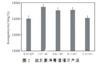 將不同批次的發(fā)酵罐中篩選到的具有遺傳多 樣性的菌株作為出發(fā)菌株,利用小金色鏈霉菌(S. microaureus)分離平 板 篩 選 到 了 到5株 遺 傳 差 異 大的菌株,分別為 S17-128,S17-261,S18-050,S 18-051,S18-081,這5株菌株作為 Genomeshuff- ling的出發(fā)菌株.產(chǎn)量最高的菌株S17-261的春雷 霉素產(chǎn)量為14738mg/L,見(jiàn)圖2所示。