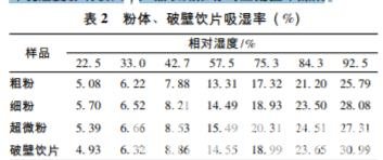 表 2 顯示,25 ℃ 下超微粉 吸濕速率最大,低濕度下破壁飲片吸濕速率小于粗粉和細 粉,中濕度下破壁飲片、粗粉、細粉吸濕速率相近,高濕 度下破壁飲片大于粗粉和細粉,表明破壁飲片吸濕速率受 環境濕度影響較大,產品長期貯存時應配置干燥劑。
