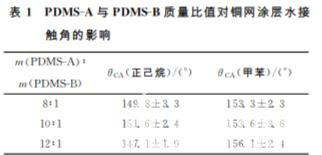 表1 PDMS-A與 PDMS-B質量比值對銅網涂層水接 觸角的影響 m(PDMS-A)∶ m(PDMS-B) θCA(正己烷)/(°) θCA(甲苯)/(°) 8∶1 149.8±3.3 153.3±2.3 10∶1 151.6±2.4 153.6±3.6 12∶1 147.1±1.9 156.1±2.4 ?。樱欤纾幔颍洌保福窗瑑蓚€組分,其中 PDMS-A 溶液為乙烯基封端的 PDMS,PDMS-B為甲基氫基硅氧 烷共聚物、含鉑催化劑、抑制劑所組成的固化劑。不同的 PDMS-A 與 PDMS-B配比影響 PDMS的固化 速率與固化程度,進而影響粒子的運動能力,因而影響成膜情況及涂層表面接觸角。另一方面,在成膜 過程中,溶劑的揮發速率也能影響粒子的運動,從而對膜的表面形貌及粗糙度造成影響。因此我們首先固定浸涂液組分為2.5gPDMS與3.125gSiO2,將 兩者溶解在50mL正己烷或甲苯溶液中,銅網在浸涂 液 中 的 浸 泡 時 間 為 5 min,銅 網 的 提 拉 速 度 為 0.05mm/s,涂層的固化溫度為80℃。改變PDMS-A 與 PDMS-B 的 質 量 比,考察其對銅網涂層水接觸 角 (θCA)的影響,同時比較溶劑正己烷與甲苯對成膜后水 接觸角的影響。其結果見表1。