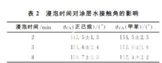 提拉前銅網在浸涂液中的浸泡時間同樣會影響疏水涂層的性能。因為銅網孔隙較小,需要足夠的 時間 才 能 使 銅 網 完 全 浸 潤。而若銅網浸泡時間過長,PDMS固化反應在溶液中大量發生,形 成 交 聯 PDMS網絡的過程可能會影響SiO2粒子的吸附和分布,從而影響銅網的疏水性。因此實驗研究了浸泡時間對涂層水接觸角的影響,分別將銅網浸泡2,5, 8min后,以0.05mm/s的速度提拉成膜,涂層的固 化溫度為80 ℃。測得水在銅網涂層表面的接觸角 見表 2。 可 見,無 論 采 用 正 己 烷 還 是 甲 苯,浸 泡 5min得到的疏水銅網的水接觸角最高。因此選擇5min為最佳浸泡時間。