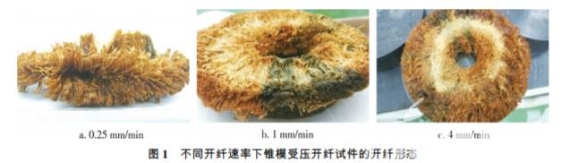軟化處理后的竹筒在開(kāi)纖試驗(yàn)機(jī)中以開(kāi)纖速 率為單一變量進(jìn)行錐模受壓開(kāi)纖試驗(yàn),各試件的開(kāi) 纖形態(tài)如圖 1 所示。