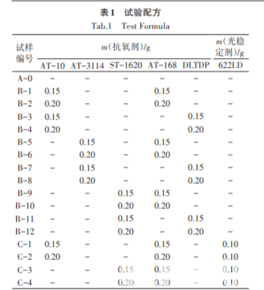 C5 石油樹脂(軟化點為 100~102 ℃,Gardner 色 號為 6#,熔融黏度為 225~240 mPa · s,溴值為 58~ 63 cgBr·g-1),工業(yè)級(牌號 YH-1288),寧波甬華樹 脂有限公司;抗氧劑AT-10、AT-168、AT-3114,工業(yè) 級,寧波金海雅寶化工有限公司;抗氧劑 ST-1620,工業(yè)級,上海石化西尼爾化工科技有限公司;抗氧 劑1076、抗氧劑DLTDP,工業(yè)級,天津力生化工有限 公司;光穩(wěn)定劑Tinuvin 622LD,工業(yè)級,巴斯夫。