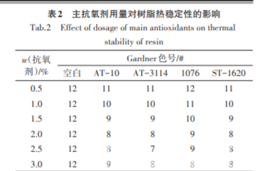 在四種主抗氧劑單獨使用情況下,同等量的抗 氧劑 AT-3114 對 C5 石油樹脂抗熱穩(wěn)定性改善效果 最好,抗氧劑 1076則表現(xiàn)最差,推測為 1076在三種 固體抗氧劑中熔程最低,在高溫老化狀態(tài)下對自由 基捕獲性能和抗揮發(fā)性較差。而唯一的液體主抗 氧劑 ST-1620 的熱穩(wěn)定性測試結(jié)果介于 AT-10 與 AT-3114之間,說明其在高溫下的抗熱氧性能與其 較低的熔程無關(guān)。