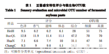豆醬是以大豆為主要原料,利用微生物經(jīng)過(guò)自然發(fā) 酵制成的半流動(dòng)狀態(tài)的發(fā)酵食品。不同發(fā)酵方法生產(chǎn)的 豆醬產(chǎn)品質(zhì)量不同。Kim等通過(guò)使用聚合酶鏈?zhǔn)椒磻?yīng)變性梯度凝膠電泳(polymerase chain reaction-denaturing gradient gel electrophoresis,PCR-DGGE)研究了10 個(gè) 豆醬樣品的微生物多樣性,結(jié)果發(fā)現(xiàn)不同樣本的群落結(jié) 構(gòu)存在一定差異。Zhu Linjiang等通過(guò)研究蠶豆醬在傳 統(tǒng)發(fā)酵過(guò)程中的微生物群落,揭示了微生物群落結(jié)構(gòu)對(duì) 發(fā)酵過(guò)程中風(fēng)味物質(zhì)產(chǎn)生的影響。因此,分析不同地區(qū) 傳統(tǒng)豆醬的微生物多樣性對(duì)于了解產(chǎn)品質(zhì)量至關(guān)重要。 Namgung等通過(guò)主成分分析發(fā)現(xiàn),氨基酸可能與口感、 風(fēng)味、營(yíng)養(yǎng)和生理活性有關(guān)。康旭等對(duì)豆醬中氨基酸 與揮發(fā)性物質(zhì)的關(guān)系分析表明,氨基酸種類(lèi)與豆醬風(fēng)味 物質(zhì)有一定的相關(guān)性,酸性氨基酸會(huì)增加豆醬的鮮味, 中性氨基酸可能產(chǎn)生丁香味的風(fēng)味物質(zhì),堿性氨基酸對(duì) 風(fēng)味影響較小。可見(jiàn),氨基酸對(duì)豆醬產(chǎn)品質(zhì)量起著重要 作用?;谝陨衔⑸锶郝浣Y(jié)構(gòu)與游離氨基酸對(duì)豆醬質(zhì) 量的影響,本實(shí)驗(yàn)采用高通量測(cè)序技術(shù)和氨基酸分析技 術(shù)研究不同地區(qū)豆醬產(chǎn)品的質(zhì)量,采用偏最小二乘回歸 (partial least-squares regression,PLSR)模型分析豆醬微 生物多樣性和游離氨基酸組成的相關(guān)性,尋找?guī)追N不同 豆醬產(chǎn)品質(zhì)量差異的原因,并為將來(lái)企業(yè)提高產(chǎn)品質(zhì)量 提供理論依據(jù)。本實(shí)驗(yàn)具體分析得到豆醬中游離氨基酸 的組成以及豆醬中微生物結(jié)構(gòu)組成的關(guān)系,并明確東北 地區(qū)質(zhì)量較好的豆醬產(chǎn)品。