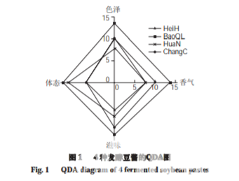 (quantitative descriptive analysis, QDA)法評(píng)價(jià)豆醬樣品的質(zhì)量 QDA是一種以描述性分析為主的對(duì)樣品進(jìn)行感官評(píng) 定的方法,利用多元統(tǒng)計(jì)方法分析獲得數(shù)據(jù),對(duì)樣品進(jìn) 行定性和定量相結(jié)合的分析。具體分析過(guò)程為:首先挑 選評(píng)定員組成定量描述分析小組,提出并挑選能反映樣 品感官特性的描述詞匯,然后采用線性標(biāo)度對(duì)其進(jìn)行評(píng) 價(jià)打分,打分結(jié)束后進(jìn)行統(tǒng)計(jì)分析,用雷達(dá)圖直觀表示 對(duì)測(cè)定樣品的質(zhì)量評(píng)價(jià)。本研究挑選10 名評(píng)定員,從色 澤、香氣、滋味和體態(tài)4 個(gè)方面對(duì)不同地區(qū)的發(fā)酵豆醬樣 品進(jìn)行質(zhì)量評(píng)價(jià),評(píng)價(jià)結(jié)果采用QDA圖表示。