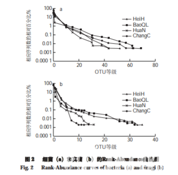 在Rank-Abundance曲線中,OTU等級(jí)代表系統(tǒng)群落 物種的豐度,OTU等級(jí)越高,表示系統(tǒng)里物種越豐富。 OTU曲線越平滑,表示系統(tǒng)里物種越均勻。由圖2a可 知,BaoQL的細(xì)菌物種豐度最高,物種數(shù)量分布也最均 勻,ChangC的次之;由圖2b可知,HeiH的真菌物種豐度 最高,BaoQL次之;真菌物種數(shù)量分布上,BaoQL更加 均勻,這可能與兩個(gè)地區(qū)的緯度差異和氣候不同有關(guān)。