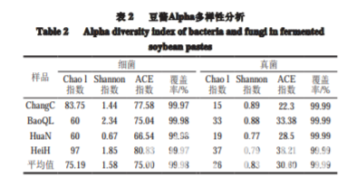 OTU分析后,分別計(jì)算各Alpha多樣性指數(shù)。由表2 可知,4 份豆醬樣品細(xì)菌的Chao l指數(shù)平均值為75.19, ACE指數(shù)平均值為75.00,Shannon指數(shù)平均值為1.58。 4 份豆醬樣品真菌的Chao l指數(shù)平均值為26,ACE指數(shù) 平均值為30.60,Shannon指數(shù)平均值為0.83。從Chao l和 ACE指數(shù)可以看出,豆醬樣品的細(xì)菌菌群豐度高于真菌 菌群豐度。從Shannon指數(shù)可以看出,豆醬樣品的細(xì)菌物 種均勻度高于真菌物種均勻度。因此,傳統(tǒng)豆醬中細(xì)菌 菌群多樣性更加豐富。