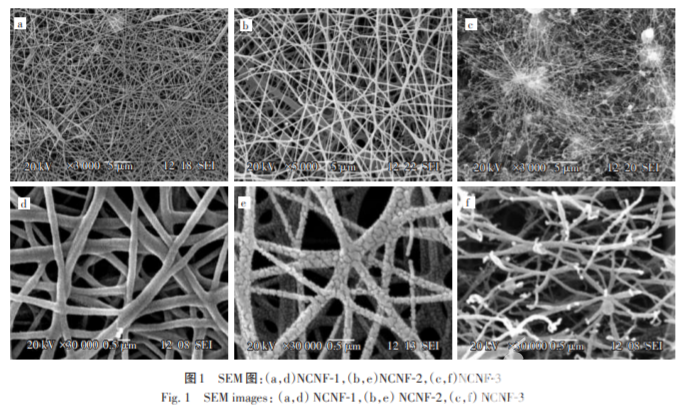 圖1為NCNFs的SEM圖。由圖1(a)和圖1(b) 可以看出,纖維的表面光滑,纖維的直徑大小比較 均一,平均直徑為 160 nm,纖維未出現珠結狀結構,說明質量分數8%的PAN紡絲溶液可紡程度較 高。圖1(c)和圖1(d)是PAN/PVP(PAN和PVP的質量比為2∶1)基NCNFs,纖維的平均直徑為150 nm, 與只加入PAN的溶液相比,纖維變得粗糙,表面出 現大量的裂紋和孔隙,主要是由于PVP 在高溫下 分解產生大量的CO2和CO等氣體,使得纖維上產 生裂紋和孔隙。圖1(c)和圖1(d)中還可以看到少 量斷裂的纖維,說明產生的裂紋和孔隙還影響 了纖維的脆性,使得纖維變得容易斷裂。圖1(e) 和圖1(f)是KOH活化處理后的NCNFs,纖維變得 彎曲緊密和粗糙,并且大量的斷裂,很難維持纖維 原有的形貌。主要是由于KOH的處理過程中與碳 纖維發生氧化還原反應,拓展了因加入 PVP 后 NCNFs 形成的孔洞,少量的 K 單質插入碳層中使 得碳層膨脹,導致NCNFs 的纖維出現大量斷裂的現象。