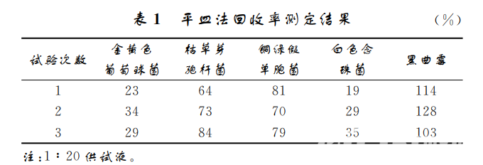 因為保婦康栓產品說明書中含莪術油,主 要 治 療 霉 菌 性陰道炎、老年性 陰 道 炎、宮 頸 糜 爛 等,說明此栓劑有一定 的抑菌作用,供試品溶液(1∶10)采用平皿法計數,意 義 不 大。于是對前期供試品溶液(1∶20)采用平皿法計數,無法 通過適用性檢查,回收率如表1所示。