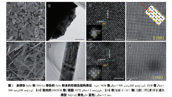 圖 2 顯示了未摻雜和 10%Cu 摻雜的 SnSe 粉末 的形貌及結(jié)構(gòu)特征。圖 2a 是未摻雜 SnSe 粉末的 SEM 像。可看到合成的產(chǎn)物具有典型的片狀形態(tài), 它的橫向尺寸在 30 ~ 200 mm 之間。圖 2b 是 10% Cu 摻雜的 SnSe 粉末的 SEM 像。可看到摻雜后產(chǎn) 物形態(tài)變成了長(zhǎng)條狀或長(zhǎng)線狀,它們的寬度都在 30 nm ~ 10 μm 之間。經(jīng)過研究,發(fā)現(xiàn) SEM 像中直接看 到的表面基本上都為微米片的{ 100} 面,{ 100} 面是 這些微米片上最典型的表面。圖 2c、2d 分別為未摻 雜和 10%Cu 摻雜的 SnSe 粉末的 TEM 像,從襯度看 顯示為單晶體,相應(yīng)的區(qū)域高分辨圖像圖 2e 和 2f 也說明其高質(zhì)量單晶結(jié)構(gòu),其中插圖為所選擇區(qū)域 的 FFT 圖像,顯示這是取向的 HRTEM 像。本 文對(duì)兩種 SnSe 的晶格常數(shù)和夾角進(jìn)行了測(cè)量,測(cè)量 了 10 個(gè)晶格的距離之后算得平均值,未摻雜時(shí) b 軸 和 c 軸方向的晶格常數(shù)分別為 0. 4628 nm 和 0. 4484 nm,夾角為 86°,這與報(bào)道的 b 軸 0. 444 nm,c軸 0. 4135 nm,夾角 86°一致; 而摻雜 10%Cu 之后 b 軸和 c 軸方向的晶格常數(shù)為 0. 4487 nm 和 0. 4380 nm,晶格夾角變?yōu)?88°,這些變化說明摻雜 Cu 后 SnSe 晶體發(fā)生了晶格畸變,晶格常數(shù)變小,與上述 XRD 結(jié)果一致。考慮到 Cu 原子與 Sn 原子之間原子 半徑的差異,這種晶格變化證明了 Cu 元素的成功摻 雜。此處需說明的一點(diǎn): 本文電鏡測(cè)量的晶格常數(shù)略,這可能與電鏡定標(biāo)的準(zhǔn)確度有關(guān),但 不影響相對(duì)值的比較。為了解 SnSe 微米片更詳細(xì)的 結(jié)構(gòu)特點(diǎn),拍攝了它們?nèi)∠虻?HAADF 像( 圖 2 g 和 2h) ,插圖為與之對(duì)應(yīng)的原子結(jié)構(gòu)模型。從中可 以發(fā)現(xiàn) Sn 原子和 Se 原子成對(duì)存在,摻雜后原子基本的正交結(jié)構(gòu)沒有發(fā)生變化,Cu 原子會(huì)替代部分 Sn 原 子并出現(xiàn)在 Sn 原子的位置上。