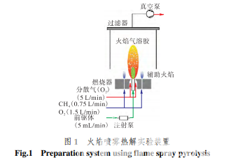 納米催化劑在商用實驗室尺度的火焰噴霧熱解 合成器(NPS10,Tethis)上進行制備.不同載體的 CuO 納米催化劑按照以下工藝流程進行.一定量的 三水硝酸銅(分析純,國藥集團化學(xué)試劑)作為銅源, 溶解于無水乙醇(分析純,國藥集團化學(xué)試劑)中.然 后,將一定量的載體前驅(qū)體,加入到硝酸銅的乙醇溶 液中.不同載體 TiO2、ZrO2 及 SiO2 所對應(yīng)的前驅(qū)體 分別為鈦酸正丁酯(分析純,國藥集團化學(xué)試劑),硝 酸鋯(分析純,國藥集團化學(xué)試劑)和正硅酸乙酯(分 析純,國藥集團化學(xué)試劑).對混合后的前驅(qū)體進行 攪拌,以至充分混合.其中,載體前驅(qū)體的金屬離子 物質(zhì)的量濃度控制在 0.5 mol/L. 如圖 1 所示,前軀體溶液通過注射泵以可控的流 率注入到反應(yīng)器內(nèi),經(jīng)過雙流體霧化形成噴霧,被甲 烷/氧氣預(yù)混輔助火焰點燃.其中的前驅(qū)體溶質(zhì)開 始氧化、分解,并在高溫火焰中解離為原子狀態(tài),然 后經(jīng)歷成核、碰撞凝并、燒結(jié)、冷凝等生長過程形成 金屬氧化物顆粒氣溶膠.當(dāng)氣溶膠到達溫度較 低的區(qū)域時,碰撞凝并的顆粒進一步形成團聚體,并 在真空泵的輔助下通過反應(yīng)器上方玻璃纖維處的過 濾器進行收集.將附著在過濾器上的一層納米顆 粒刮取下來便獲得所制備的納米催化劑.