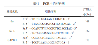 平目湯,由黃芪 30 g,淫羊藿 15 g,川芎 15 g,白芥子 15 g,炙鱉甲 15 g,車前子( 包煎) 30 g 組成,由 上海中醫藥大學附屬龍華醫院中藥房制備成水煎劑( 生藥 含量為 4 g /mL) ,4 ℃保存。 Trizol Reagent,Life Technologies Corporation 公 司; DEPC( RNA 酶抑制劑) ,Sigma - Aldrich - Life Science 公 司; 無水乙醇、75% 乙醇、異丙醇、氯仿、十二烷基硫酸鈉 ( SDS) ,國藥集團化學試劑有限公司; 逆轉錄試劑盒( GoScripTM Reverse Transcription System) ,Promega 公司; 臺盼藍 染液、One cell 細胞計數板,上海魯汶生物科技有限公司; 引物合成,上海閃晶分子生物科技有限公司; Fas 抗體、Fas L 抗體,美國 abcam 公司; GAPDH 單克隆抗體,美國 CST 公 司; 辣根過氧化物酶標記的二抗,美國 Jackson ImmunoResearch 公司; 生理鹽水,上海長征富民金山制藥有限公司; Protein Marker ( PageRulerTMPlusPrestaind Protein) ,Thermo Fisher Scientific 公司; 蛋白酶抑制劑,Roche Diagnostics 公 司; 微量 BCA 蛋白定量試劑盒,康為世紀公司; 20% SDS solution、Tris - Hcl Buffer( pH 為 6. 8) 、40% 丙烯酰胺( 40% Acr) 、四甲基二乙胺( TEMED) ,BIO - RAD 公司; Tris - Hcl Buffer( pH8. 8) ,北京索萊寶( Solarbio) 科技有限公司; SDS - PAGE 上樣緩沖液( 5 × ) ,碧云天生物技術研究所; 甘氨 酸( MW75. 07) 、Tween 20,SIGMA - ALDRICH 公司; 氨基 丁三醇( Tris) ( MW121. 14) ,Sigma 公司; 硝酸纖維素膜 ( PVDF 膜) ,Millipore 公司; 麗春紅染色試劑,康為世紀公 司; 脫脂奶粉( 國產伊利牌) ,內蒙古伊利實業集團有限公 司; 顯影劑試劑盒( Immobilon Western 化學發光底物) ,Millipore 公司; 胎牛血清,Biowest; DMEM 培養基,上海立菲生 物技術有限公司( life technologise) ?;蛐蛄型ㄟ^ GenBank 獲得,由上海閃晶分子生物科技有限公司設計并合 成。引物序列見表 1。