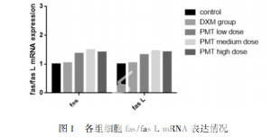與空白 對照組相比,平目湯各組 fas、fas L 蛋白表達均上調,差異有 統計學意義( P < 0. 05) ,地塞米松組無統計學差異( P > 0. 05) 。在升高 fas 表達方面,平目湯高劑量組與平目湯中 劑量組、平目湯低劑量組比較,差異有統計學意義( P < 0. 05) 。平目湯中劑量組與平目湯低劑量組比較,無統計學 差異( P > 0. 05) 。