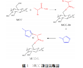 將15mL1-甲基咪唑和1.00gMCC-Br加入 80mL乙醇中,70 ℃水浴恒溫攪拌反應(yīng)24h后, 將粗產(chǎn)物用無水乙醇洗滌,將所得產(chǎn)物用離心機以 3000r/min的速度離心3min.之后置于60 ℃真 空干燥箱內(nèi)干 燥12h,最終得到離子液體改性微 晶纖維素(MCC-IL).