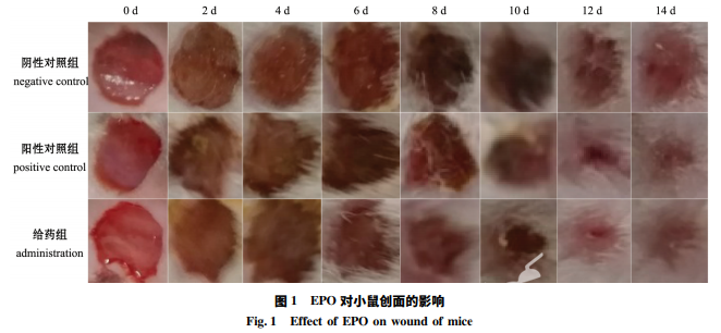 選取 SPF 清潔 級昆明雄性小鼠 60 只,隨機分為 3 組,每組 20 只,分別為陰性對照組、云南白藥陽性對照組和 EPO 給藥組。將小鼠用 10%水合氯醛腹腔麻醉后, 背部剃毛、消毒。在小鼠背部剪去直徑約 0. 8 cm 的全層皮膚,造成全皮層創傷動物模型。每只小鼠 均分籠飼養,給藥組每天涂抹 30 ~ 35 mg EPO ( 肽 含量為 1. 5 ~ 2. 5 mg) ,陽性對照組每天涂抹 2 ~ 3 mg 云南白藥,陰性對照組不做任何處理。每 2 天 對小鼠創傷口面觀察、拍照、測量傷口大小,并記 錄結果。