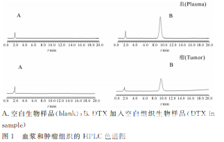 精密量取空白血漿或腫瘤組 織勻漿0.5mL,分別加入100μL不同濃度的 DTX 儲備液,配 制 成 有 不 同 濃 度 DTX 的 生 物 樣 品,按 “樣品的處理”進行處理和測定,高效液相記錄色譜 圖及 DTX 的峰面積,以 DTX 的峰面積對 DTX 的 濃度進行線性回歸,血漿及腫瘤組織的標準曲線在 0.101~20.20μg·mL-1范圍內線性關系良好。